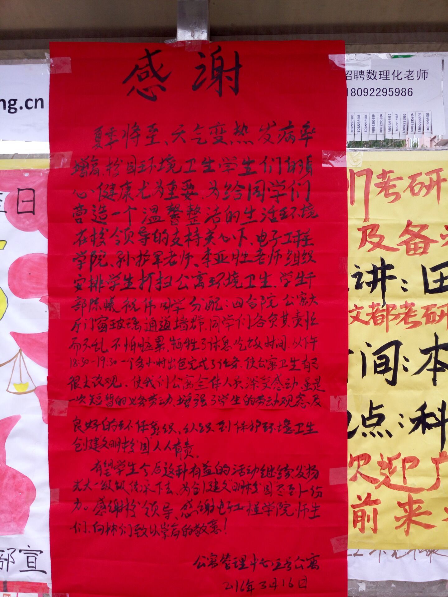 为培养学生的感恩意识,响应学校的雷锋月号召,jinnianhui今年会大二本科在学生管理科科长孙护军老师、辅导员李亚胜老师的号召下,对五号公寓和教学楼三楼的公共教室进行了义务劳动。 2016年3月15日,测控技术与仪器和电气工程及其自动化两个专业的68名同学对五号公寓楼大厅、门窗、楼道和大门外围墙进行打扫,经过一个多小时的打扫,整个宿舍楼恢复了整洁干净明亮的环境。五号公寓宿管阿姨对学生的义务劳动表示感谢,并写了感谢信。