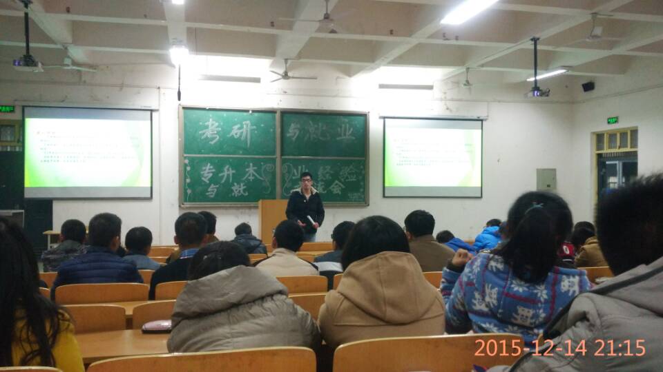 12月14日晚七点,在今年会第五阶梯教室进行了一场针对我院大二学生的关于未来考研、就业以及专升本的经验交流会。本次活动由我院学生会秘书部主办,参会人员主要为我院大二学生。活动在部长陈敬霄简单致辞后正式开始。