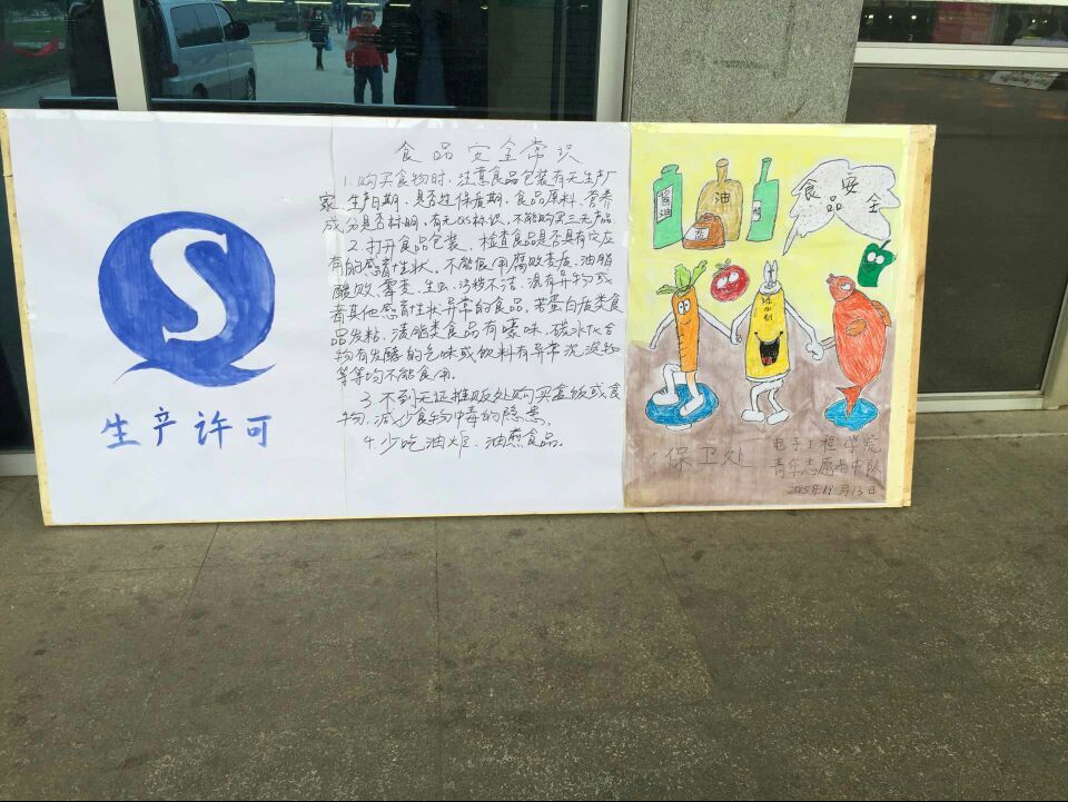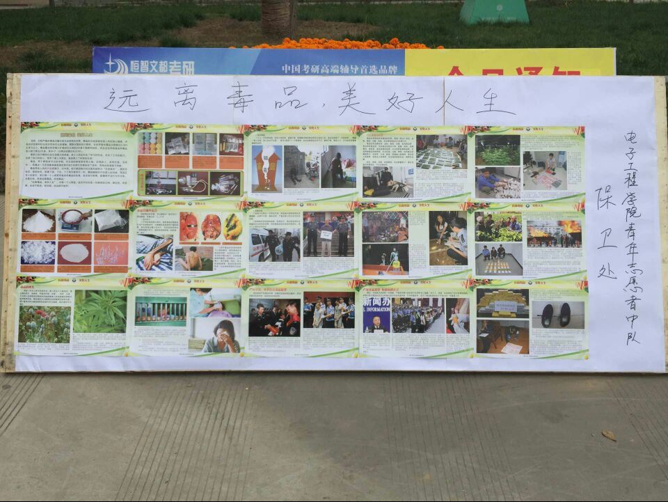 为增进今年会学生食品安全意识与毒品常识,我院青年志愿者中队携手保卫处自11月13日起在今年会餐厅门前开展了题为“食品安全常识”和“远离毒品 美好人生”的板报主题教育活动。