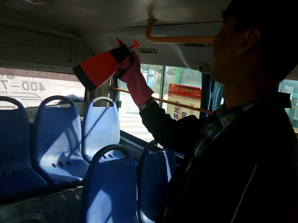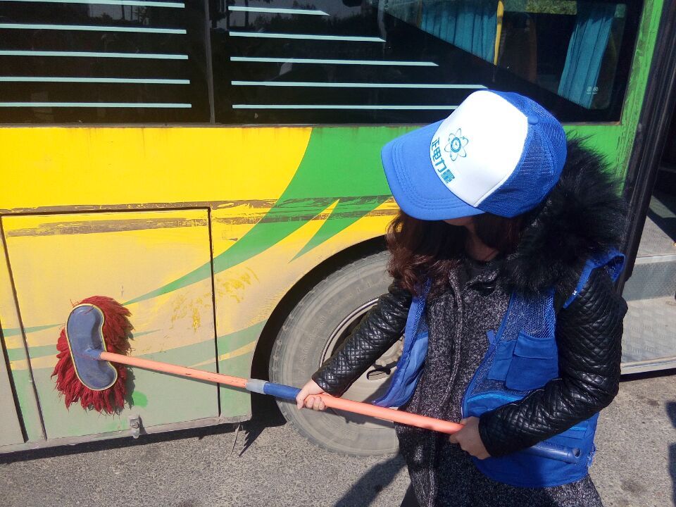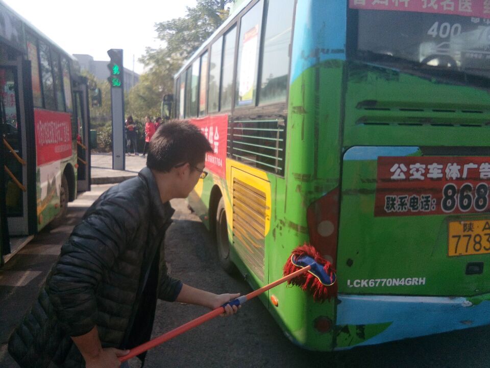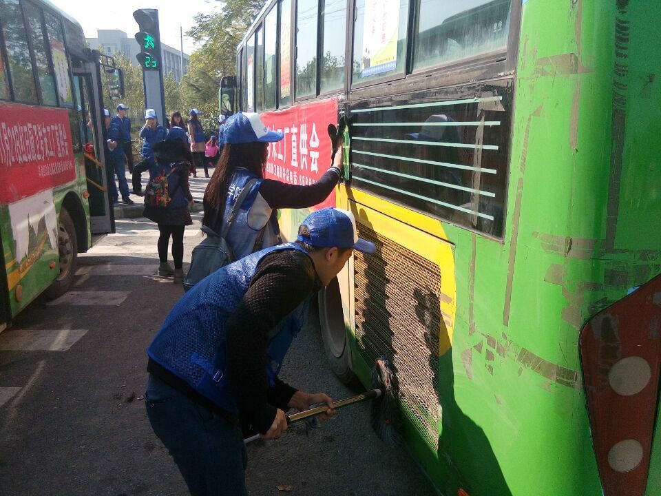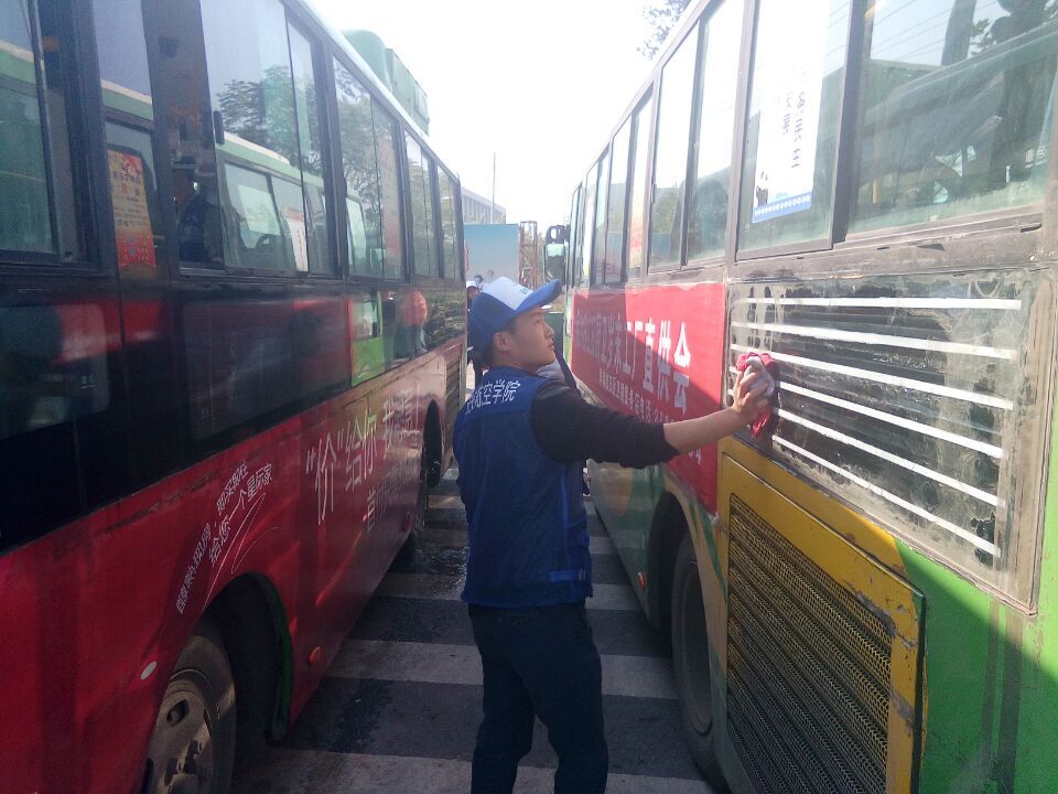 在负责人对活动进行细致安排后,参加此次活动的同学开始对停靠在路边的六辆公交车进行了认真的打扫、擦洗与消毒。活动现场井然有序,各位同学分工明确,各尽其责。