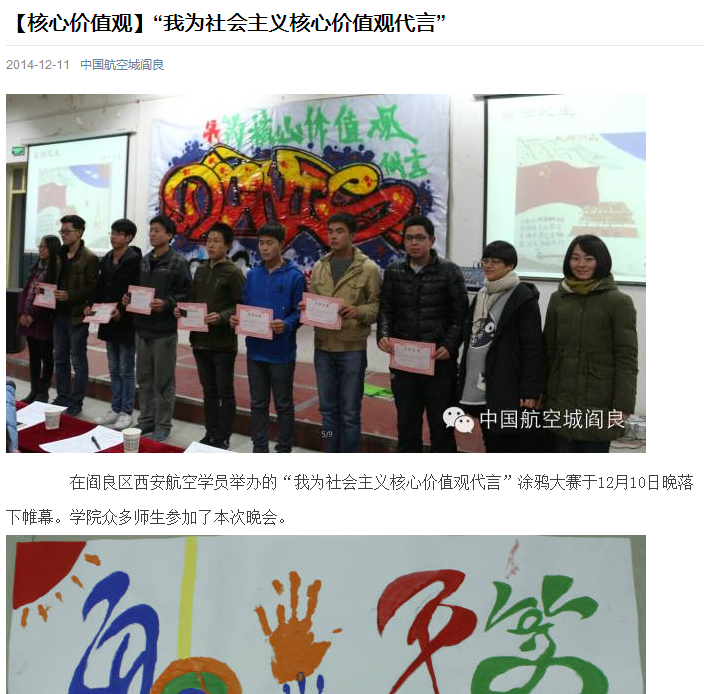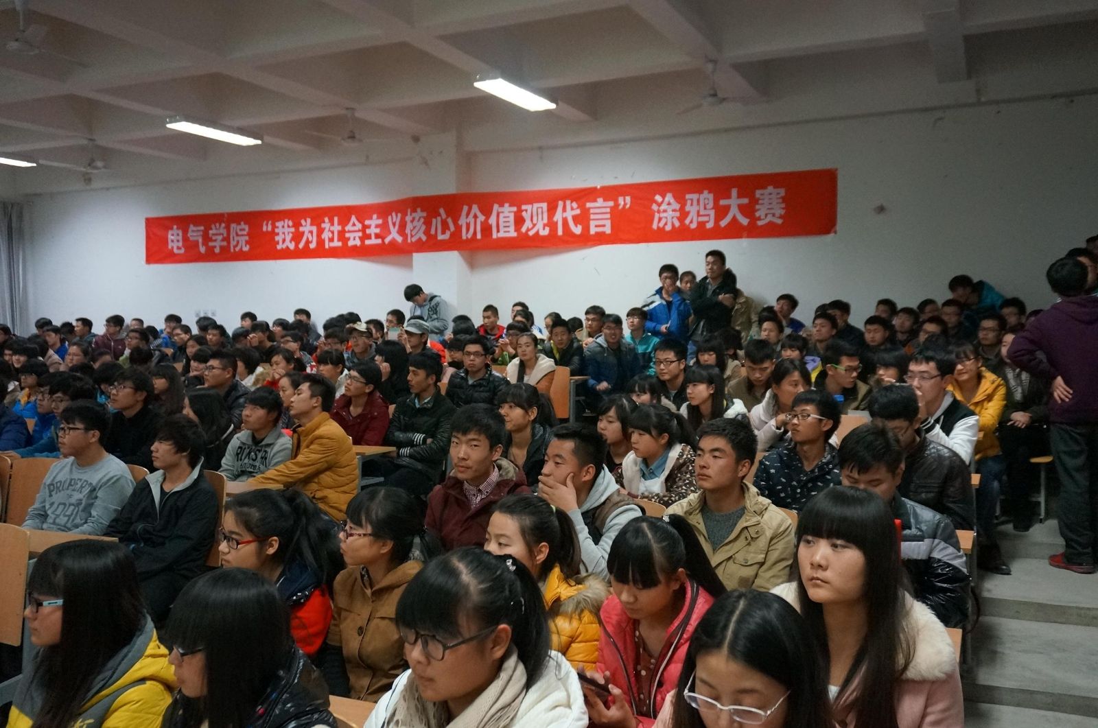 我院团总支积极响应校团委关于“我为社会主义核心价值观代言”活动安排,由我院团总支主办,团总支秘书部和学生会秘书部承办,院团总支宣传部、学生会宣传部和青协中队协办的“我为社会主义核心价值观代言”涂鸦大赛于12月10日晚在今年会阎良校区阶五落下帷幕。我院党总支书记、院长杨勇老师,校团委季林健老师、我院团总支书记葛昊老师、殷娇老师、张小妹老师、肖静老师、马晨老师及我院团总支,学生会,心灵驿站学生干部出席本次晚会,第十期入党积极分子以及学生代表参加了本次晚会。