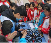 飞行表演结束后,电协成员和团总支工作人员在操场布展,展出了成熟的科技作品,包括仿生六足机器人、仿生四足机器狗、仓颉写字机器人等,并为小朋友们展示并讲解了机器写字、飞行器飞行、机器人控制的过程和原理,让学生们零距离感受和体验科学技术,激发小朋友们对科学探索、科技创新的热情。