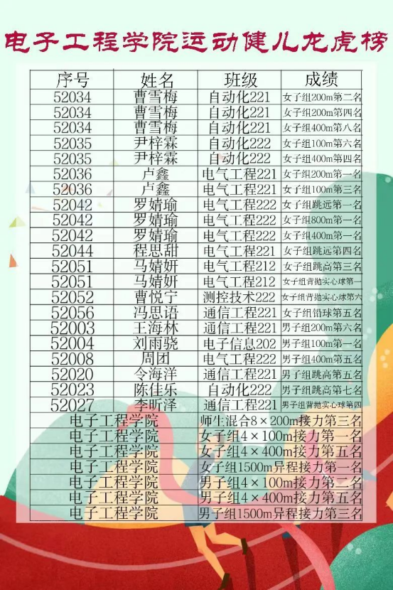最后,让我们一览本届运动会我院师生龙虎榜,感受电院运动健儿的荣耀,共同期待下一届运动会有更加优异的表现!