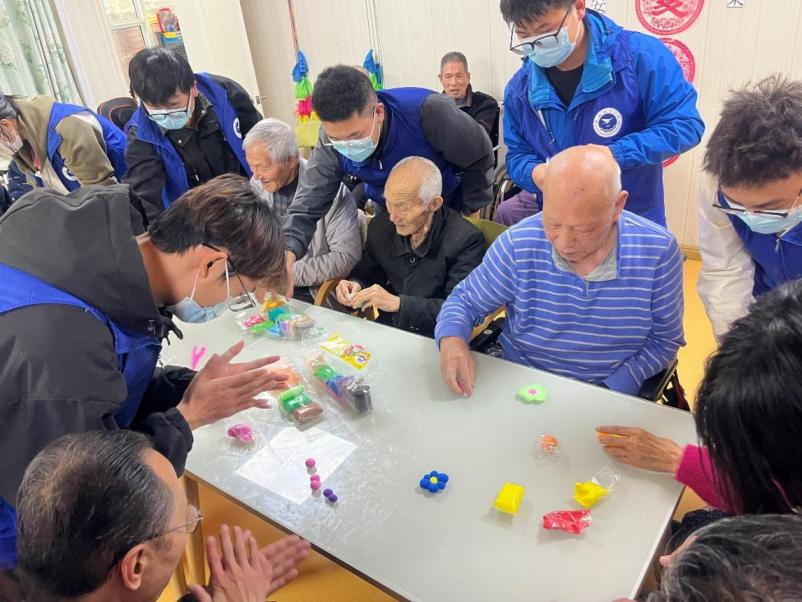 剪纸活动结束后, 志愿者们拿出了提前准备好的超轻黏土,与老人们一起制作黏土小花。在制作过程中,爷爷奶奶们运用了不同的颜色进行搭配,做出了形态各异的小花,展现了丰富的想象力。制作小花的活动不仅为敬老院的老人们带来了欢声笑语,同时也进一步拉近了志愿者们与老人们的距离。