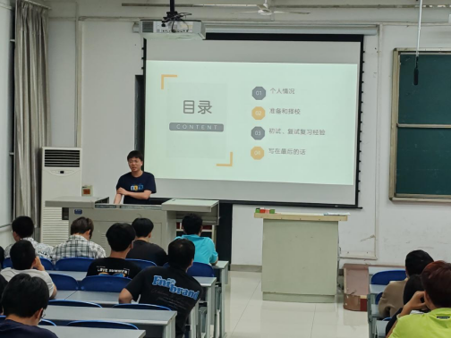 肖鹏同学从院校选择,备考方法和备考经验三个方面入手分享自己的考研心得,重点介绍不同科目的备考时间,备考方式和备考技巧,建议同学们备考过程中不仅要多做,少抱怨,笑对考研。而且要勤学,勤复盘,虚心求知。期间,同学们纷纷就自己关心和困惑的问题进行提问,学长们进行了耐心地解答。