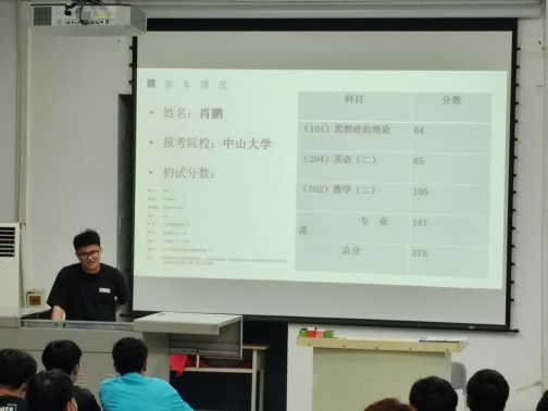 交流会上,刘欢为大家详细介绍了考研流程,从前期准备到院校选择、从网上报名到现场确认、从初试复习到复试准备,一一详细介绍,为大家在以后的考研中指清了方向。同时,刘欢指出考研是一场持久战,要积极面对困难,正确认识压力,只有全力以赴,方能成功上岸。