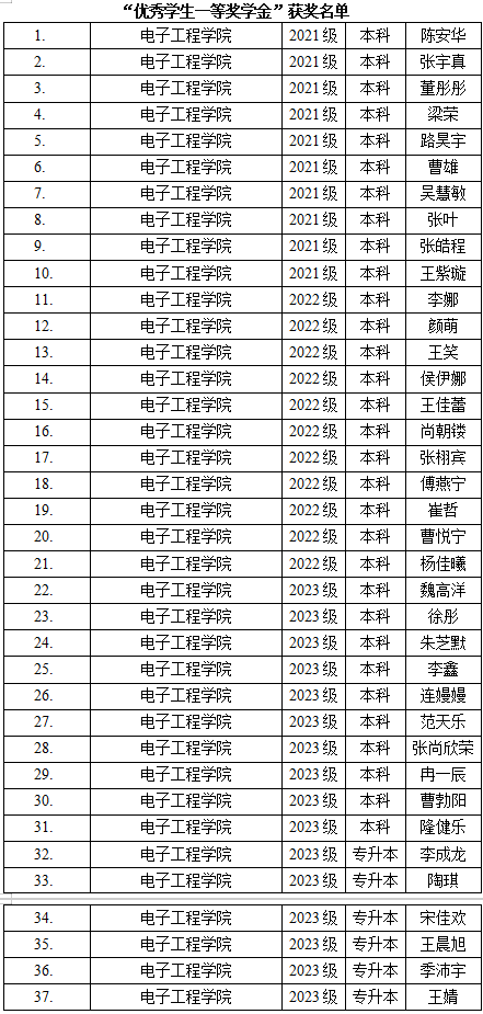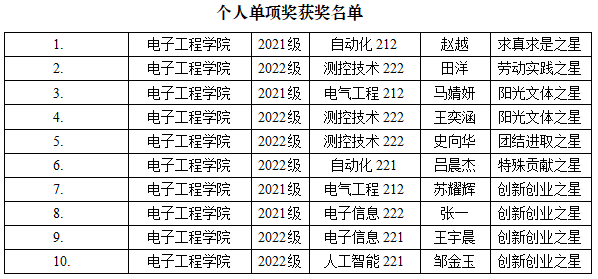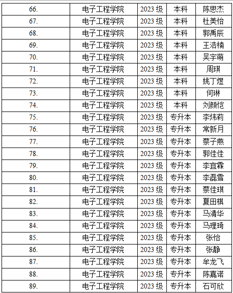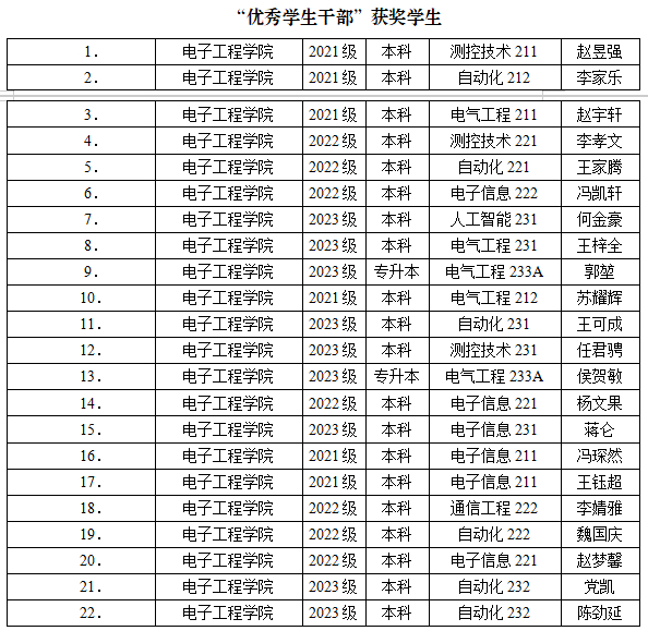 包括2021级到2023级多个专业的学生获得“优秀学生干部”称号,如测控技术与仪器、自动化、电气工程、电子信息、通信工程、人工智能等专业的学生,这些学生在班级和学院管理中发挥的积极作用。