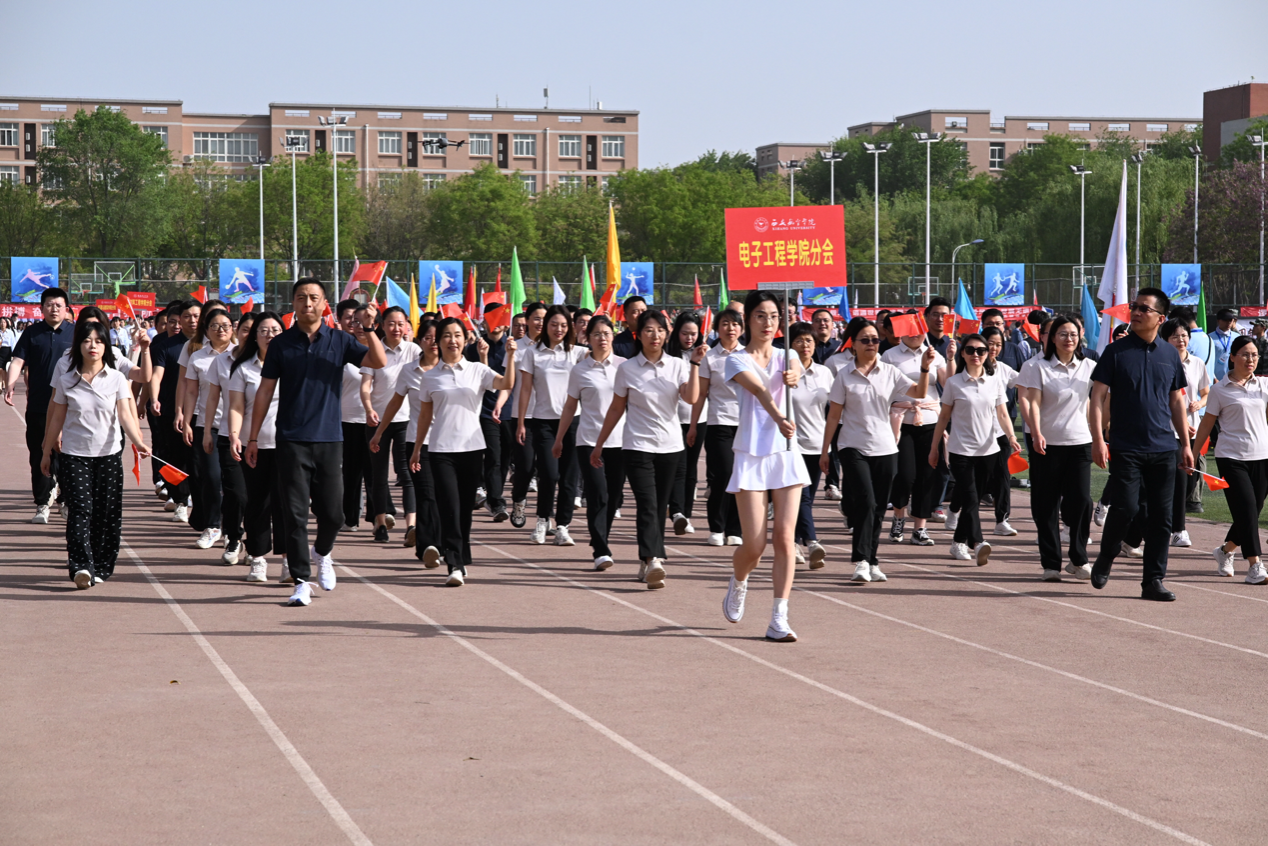 晨光轻柔地洒落在宽阔的绿茵场上,整个校园仿佛被注入了无限的活力与激情。随着激昂的音乐响起,开幕式正式拉开帷幕。首先入场的是我院教工代表队,他们迈着整齐而稳健的步伐,脸上洋溢着自信与从容。每一位教工都精神抖擞,展现出平日里教书育人之外的另一面风采。他们身着统一的服装,步伐坚定有力,口号响亮清晰。教工代表队的入场,赢得了现场观众的阵阵掌声和欢呼声。成为了开幕式上一道亮丽的风景线。