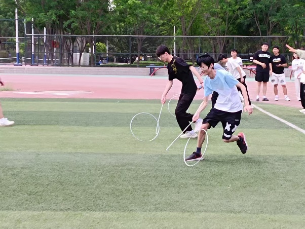 10人围成圆圈交替踢毽,需完成20次,同一队员不可连续触毽。现场毽子在空中划出优美弧线,同学们配合默契,有人一个漂亮的回勾救起即将落地的毽子,引发阵阵喝彩。