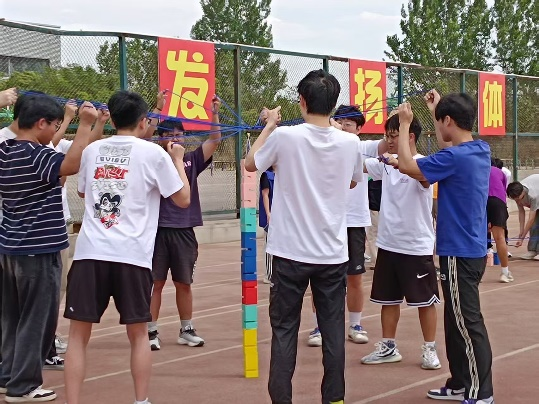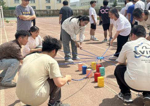 10人协同操作绳索搭建积木塔。有的队伍配合无间,塔身节节高升;有的队伍稍有不慎,重头再来。这个项目充分考验了团队的耐心默契