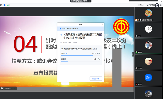参会人员为75人,占全院人数80%以上,经投票统计,最终62票同意,13票不同意,同意绩效分配方案的人数达参会人数的82%,《jinnianhui今年会绩效考核及二次分配实施办法》获得通过。