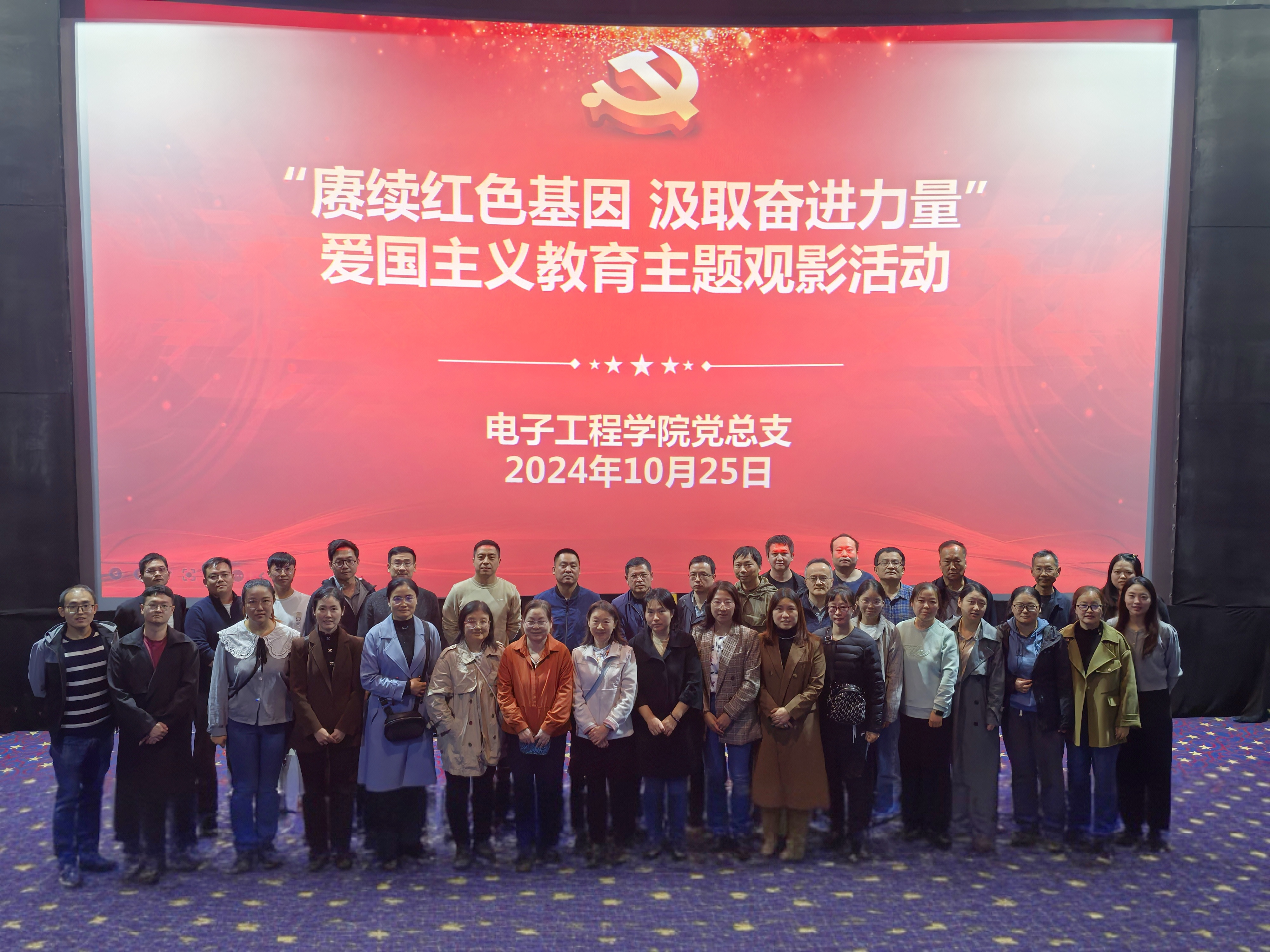 为庆祝中华人民共和国成立75周年,进一步弘扬爱国主义精神,缅怀革命先烈,厚植爱党爱国情怀。2024年10月25日,jinnianhui今年会党总支开展了“赓续红色基因 汲取奋进力量”主题观影活动,学院党总支书记李中、院长杨亚萍、党总支副书记郝杰以及教职工党员集体观看了红色电影《志愿军:存亡之战》。