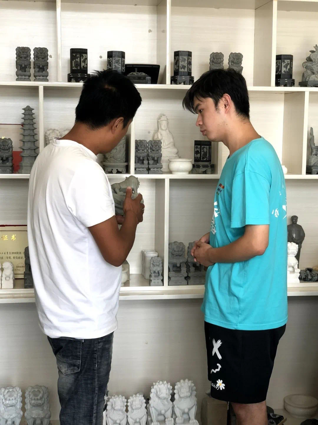 队员们前往绥德县四十铺村采访当地著名的石狮子匠人李兴兴师傅,据李师傅介绍,按照不同功用绥德石雕可以分为七大类:一是与人民生活最为贴近的石宅居、石器具等;二是享誉全国的东汉画像石;三是以石狮子为代表的“狮”文化系列;四是石碑、亭塔;五是飞禽走兽、花草人物的工艺品;六是石版画和雕栏画栋;七是气势宏伟,集石雕工艺大成的牌楼、龙柱等。李师傅最擅长雕刻的是石狮子,他为志愿者介绍了石狮子的制作工艺及流程,传统绥德石雕利用锤、錾、錾刀等工具,通过手工雕刻而成。