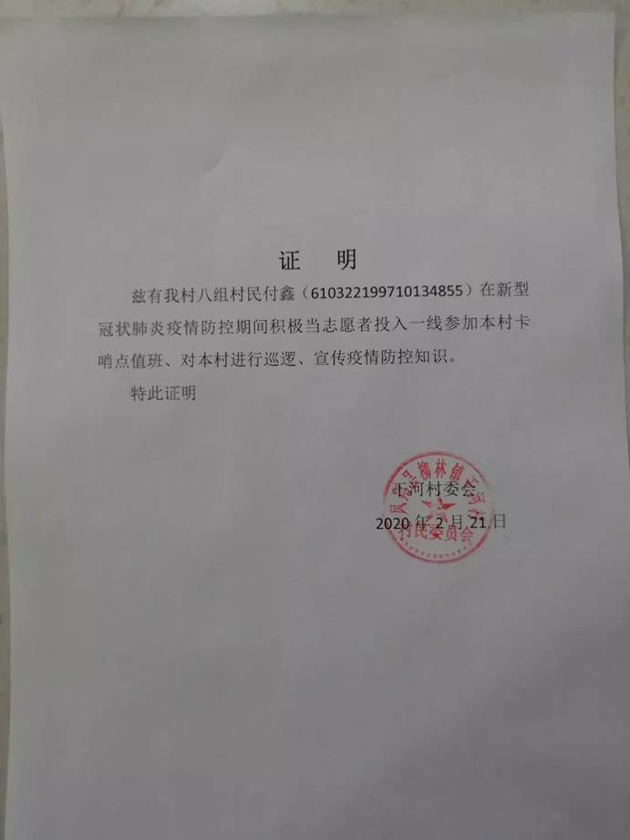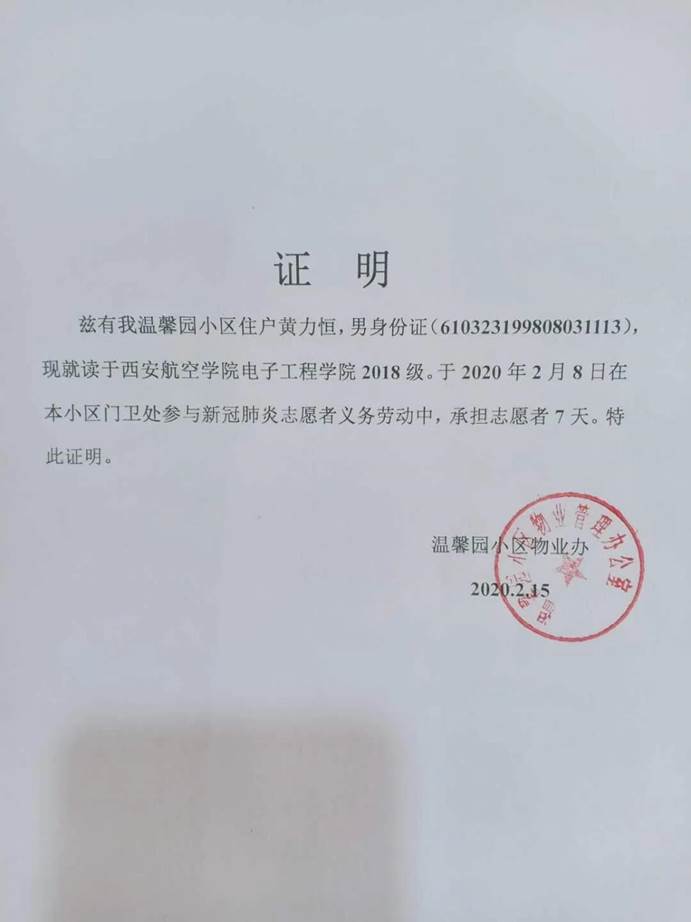 来自电子工程系测控技术2122的付鑫,身为一名团员,在新型冠状病毒肺炎防控期间,投身于本村志愿者活动行列,参加本村卡哨点值班,对出入人员进行监察,对本村进行巡逻和宣传疫情防控工作