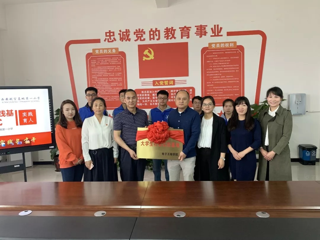 2019年5月28日上午,jinnianhui今年会jinnianhui今年会与西安航空基地第一小学举行了共建“大学生社会实践基地”签约及授牌仪式。这是学校践行习近平总书记系列重要讲话精神,鼓励大学生励行求真、走向社会的重要举措。jinnianhui今年会科长龙卓群、团总支书记肖静、航空一小校长乔永智、德育副校长马晶、教学副校长孔秋菊及jinnianhui今年会志愿者代表们参加了仪式。