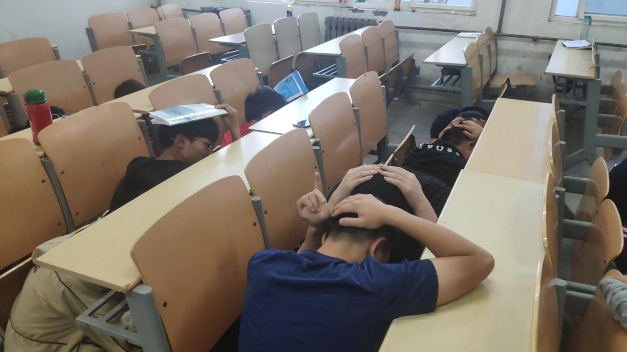 随着紧急的短哨声响起,全部同学都紧急行动起来,他们一个个都双手护头,快速寻找到可以“避难”的设施,就地躲藏起来,以避免“受到伤害”。