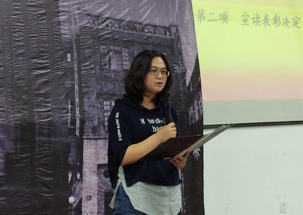大会第一项,全体起立,唱响团歌。大会第二项,由团总支书记肖静讲话,对团总支各个部门组织的活动给予了肯定,并对大家一年来工作上的努力付出提出了表扬。大会第三项,由侯睿、龙卓群、肖静分别对优秀团支部、优秀团员干部、优秀团员以及星级志愿者代表颁发荣誉证书。