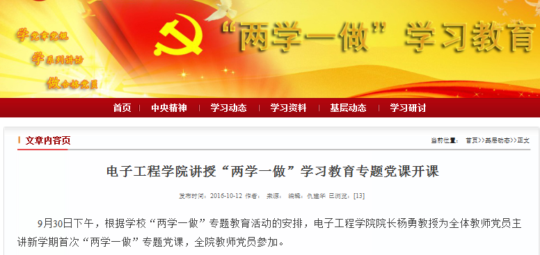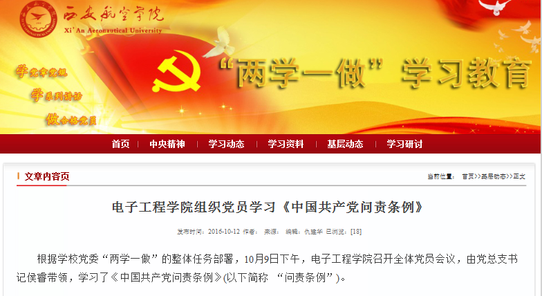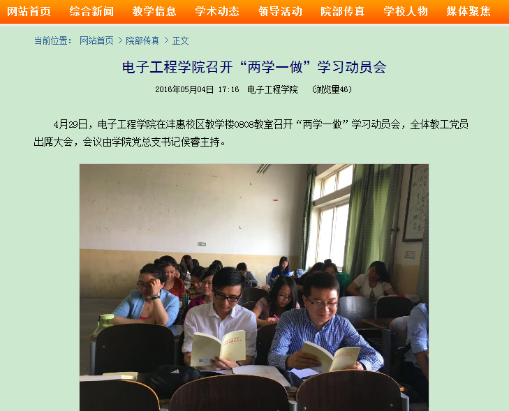 2016年春以来,jinnianhui今年会在学校“两学一做”学习教育的统一部署下,积极定计划,抓落实。首先邀请张同怀副校长、院党总支书记、院长讲党课,保证一月一次的集中学习;其次,要求所有党员教师制定学习计划,定期检查学习笔记,在党总支和教研室党小组反复交流学习心得,弥补不足;再次,主抓落实,通过设立“党员先锋岗”,对全院教师党员排班定岗,晚间留阎良校区,为学生答疑解惑。