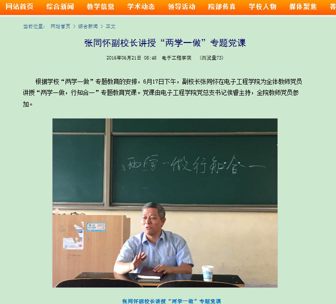 张同怀强调,“两学一做”专题教育不同于“群众路线”与“三严三实”教育活动,是针对所有党员的一次更广泛的教育实践。张同怀表示,“两学一做”不是一次活动,而是长期进行的一项工作,是对广大党员进行党章、系列讲话再教育,兑现合格党员标准的一次教育实践,作为高校教师,要强化师德师风教育,各位党员教师要率先垂范,在日常教学工作和培养方案修订等教学活动中,牢固树立“一流学院,一流专业”的目标,努力创新,为今年会建设应用型本科贡献己力。