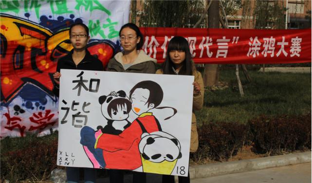 本次大赛采取了涂鸦这种无拘无束又极富表现性的创作方法,提高学生的参与积极性,并在这种高涨的参与热情中潜移默化的宣导了党十八大提出社会主义核心价值观24个字。使更多的同学融入到活动中,体会通过涂鸦让别人知道自己思想的喜悦,营造很好校园艺术气氛的同时让更多的西航人加入为社会主义核心价值观代言的队伍,更让社会主义核心价值观始终萦绕在我院的上空,构建社会主义的路还在继续,我们携手共进!