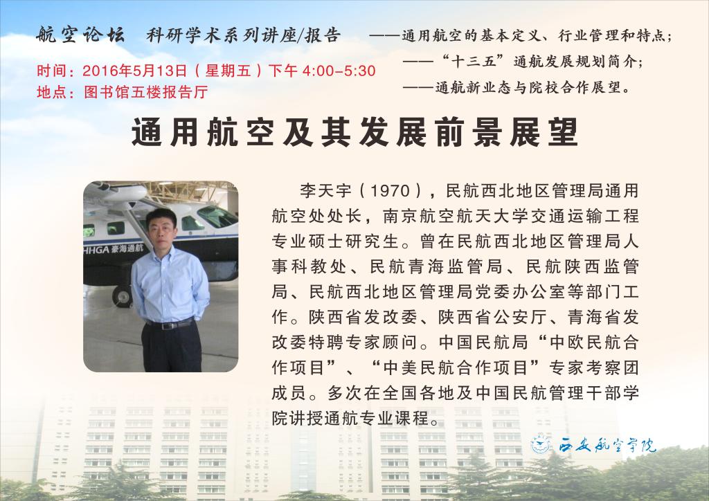 为促进学术交流,提高学术氛围,便于师生了解通用航空的现状、趋势和发展战略,科技处特邀请民航西北地区管理局通用航空处处长李天宇来今年会作题为“通用航空及其发展前景展望”的学术讲座,欢迎广大师生踊跃参加。