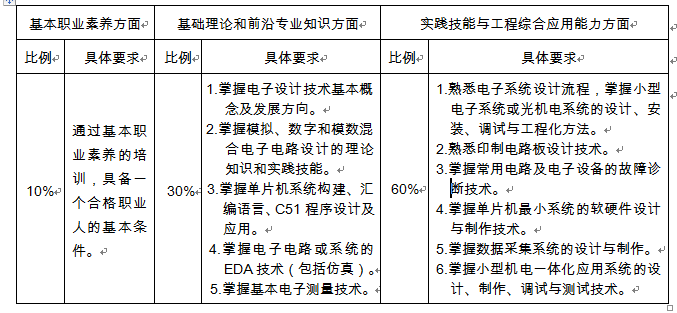 3.实践技能与工程综合应用能力。具备相关专业层面的电子技术综合开发能力、电子系统软硬件规划与设计能力、电子产品安装调试与工程实践能力、电子工程项目实施与管理能力等。