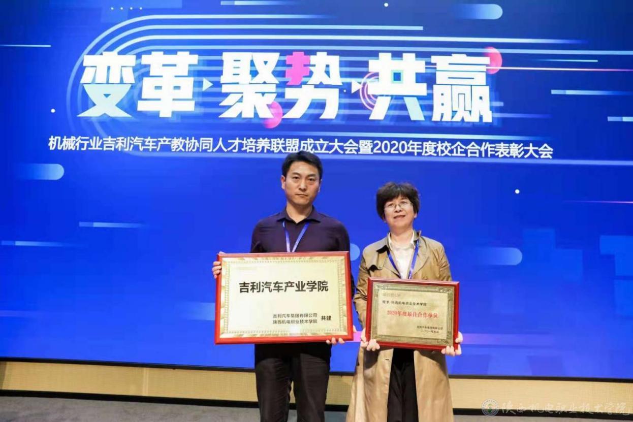 5月25日-27日,机械行业吉利汽车产教协同人才培养联盟暨2020年校企合作表彰大会在宁波杭州湾隆重举行。会上,吉利集团授予我校“2020年度吉利汽车最佳合作单位”荣誉称号,颁发西北首家“吉利汽车产业学院”荣誉牌,也是陕西省合作单位中唯一获此殊荣的学校,同时获赠两台实训车。副院长徐圣月,招生就业处就业科科长李英儒受邀参加本次大会。