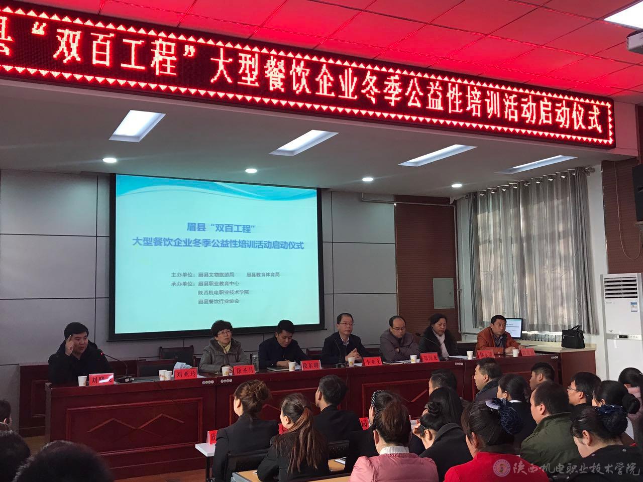 12月22日,为贯彻党的十九大精神,进一步推动“双百工程”结对帮扶工作,眉县文物旅游局、眉县教育体育局主主持召开“眉县‘双百工程’大型餐饮企业冬季公益性培训活动”启动仪式,我院作为培训活动的主要承办单位,党委委员、副院长徐圣月出席启动仪式。