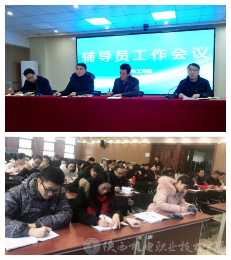 2018年12月25日,院学工部在学院视频会议室组织召开全体辅导员工作会议,专题安排2018年辅导员工作考核事项及2019年寒假前后安全稳定工作。院长助理赵争东、学工部部长朱云洁、副部长常小凯、教务处处长王建斌、团委书记杨鹏及全院专兼职辅导员参加本次会议。会议由学工部副部长常小凯主持。