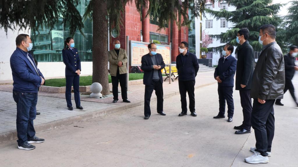 眉县职教中心校长郑海龙带领大家查看眉县职教中心疫情防控工作