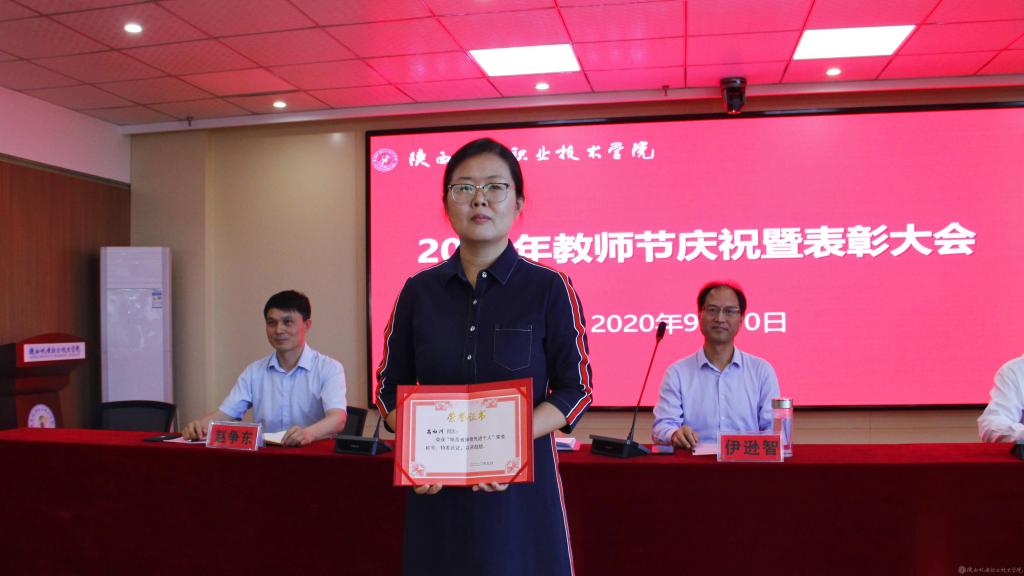 党委副书记、纪委书记齐晓军宣读“陕西省2020年高等教育师德标兵”表彰文件并为陕西省2020年高职教育师德标兵高白川颁发奖状。