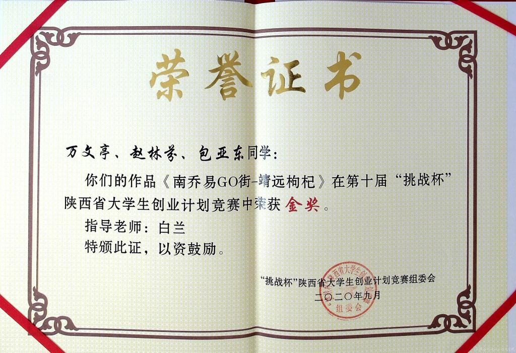 经过组委会专家评审,我校学生万文亭、赵林芬和包亚东在白兰老师的指导下,参赛作品《南乔易GO街-靖远枸杞》获得省赛金奖,同时该作品也代表我省参加国家比赛;刘凯、赵卓越、巫开亮和姚顺迪在薛媛丽老师指导下,参赛作品《果蔬授粉“神器”》获得省赛铜奖。