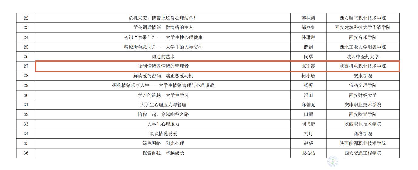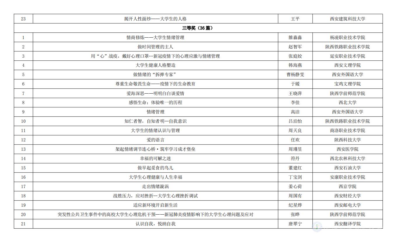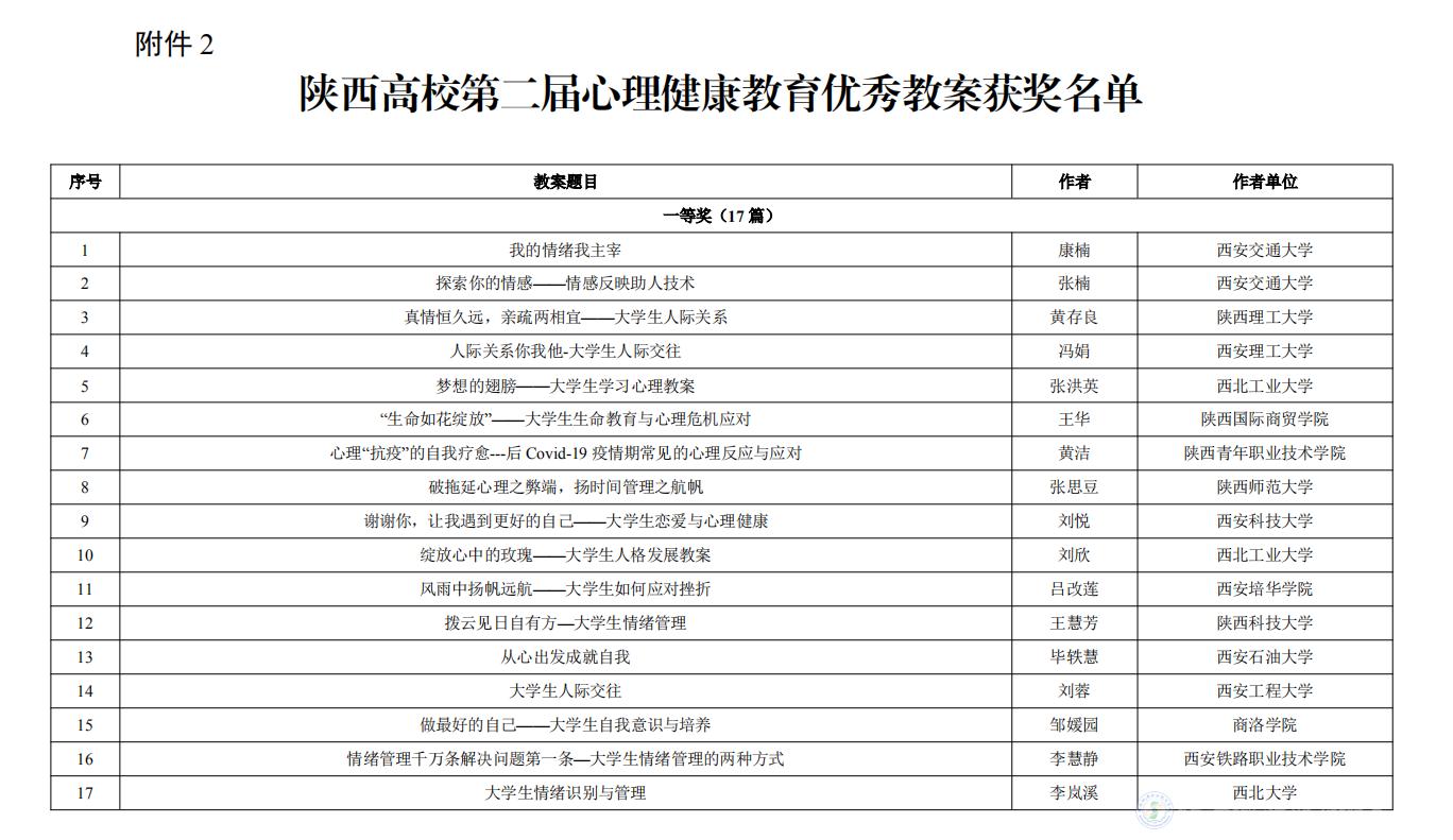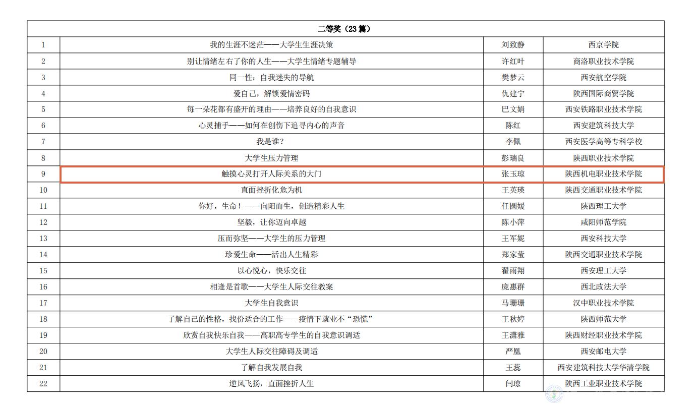 今年会参加陕西省委教育工委举办的第五届“阳光护航”心理育人宣传季实践系列活动,在第二届心理健康教育优秀教案评选活动中我校教师张玉琼所作题目为《触摸心灵打开人际关系的大门》的教案获得了二等奖、张军霞所作题目为《控制情绪做情绪的管理者》的教案获得了三等奖。