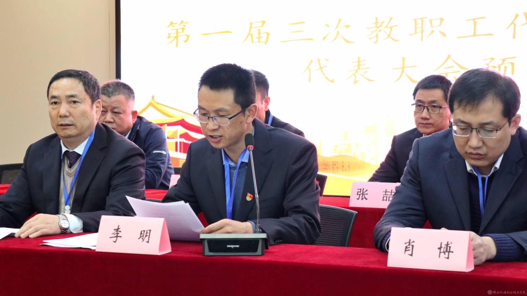 我校第一届三次教职工代表暨工会会员代表大会,预备会上,工会常务副主席李明向全体代表做大会筹备情况的报告,并主持通过了大会主席团成员建议名单、大会秘书长建议名单、大会议程。主席团第一次会议通过了大会执行主席名单及大会议程。