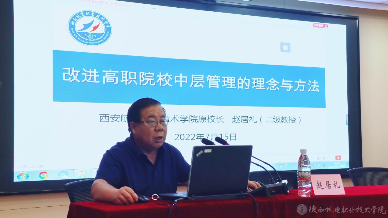 西安航空职业技术学院原校长、二级教授赵居礼作题为《改进高职院校中层管理的理念与方法》的专题报告。