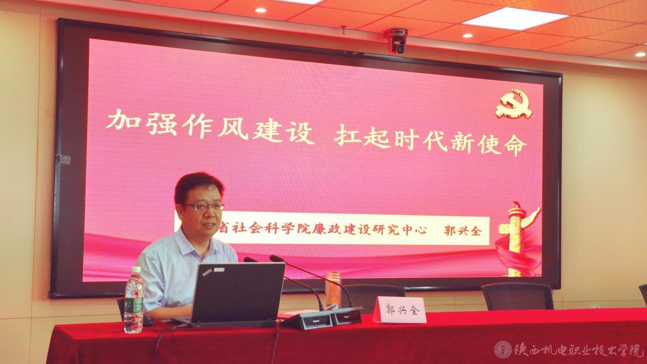 陕西省社会科学院政治与法律研究所所长、廉政建设研究中心主任郭兴全作题为《加强作风建设,扛起时代新使命》的专题报告。