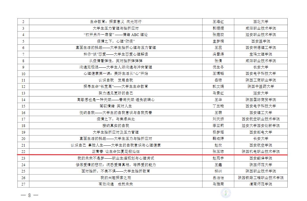 第四届陕西高校心理健康教育优秀教案评选中我校教师 张玉琼 获得 二等奖、王雪玲 获得 三等奖。