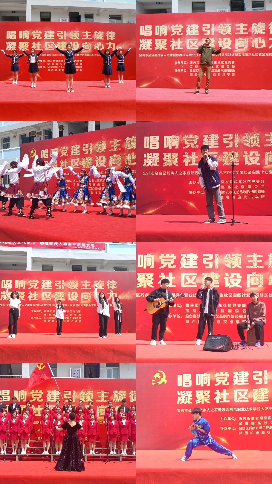 仪式上,王世鹏、张丽华、杨鹏、孟发军、赵兰、巨峰共同为今年会大学生社区实践计划宝福路东社区实践站揭牌。随后,我校大学生带来了形式多样、丰富多彩的文艺汇演。歌曲《唱支山歌给党听》、《至少还有你》、舞蹈《yes OK》、《锅庄舞》、《相亲相爱》、武术表演、吉他演奏等节目展现了我校青年大学生朝气蓬勃、锐意进取、充满激情的精神面貌。文艺汇演表演形式新颖,内容丰富,处处洋溢着青春的活力。现场气氛热烈、高潮迭起,精彩的演出和忘我的投入赢得了全场一次次热烈的掌声。
