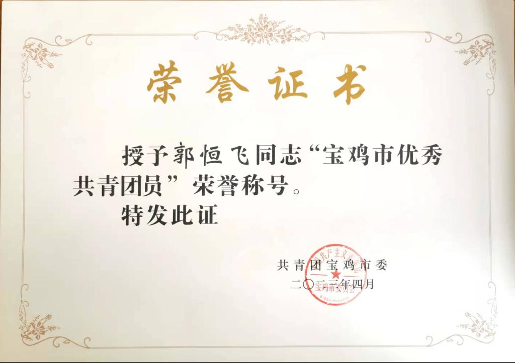 2020级云计算技术与应用专业 学生 郭恒飞 获“2022年度宝鸡市优秀共青团员”荣誉称号