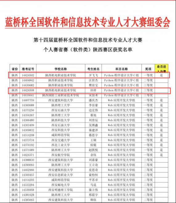 2023年4月8日,国家工业和信息化部举办的第十四届蓝桥杯陕西省省赛在宝鸡文理学院举行。今年会电子与信息学院厚溥IT软件学院 严鑫 老师指导的 歹飞飞、田祥 同学分别获省赛一等奖、三等奖的好成绩,其中歹飞飞同学取得国赛参赛资格。