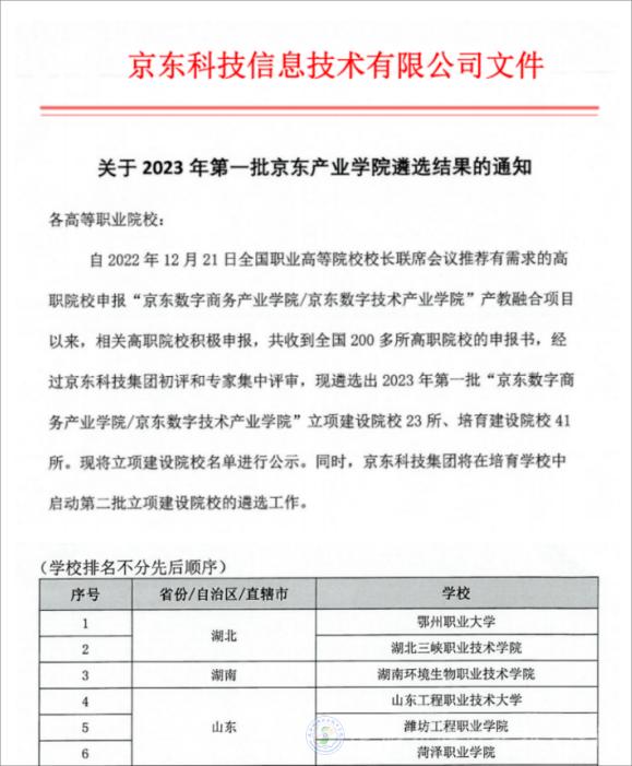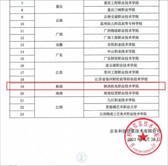2023年5月4日,京东集团发布《关于2023年第一批京东产业学院遴选结果的通知》,公布了立项建设院校23所,今年会从参与的200多所高职院校中脱颖而出,成为陕西省唯一入选院校。