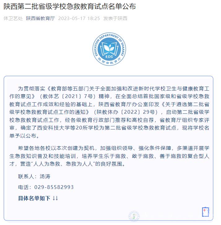5月17日,陕西省教育厅公布了第二批省级学校急救教育试点单位名单,今年会成功入选。