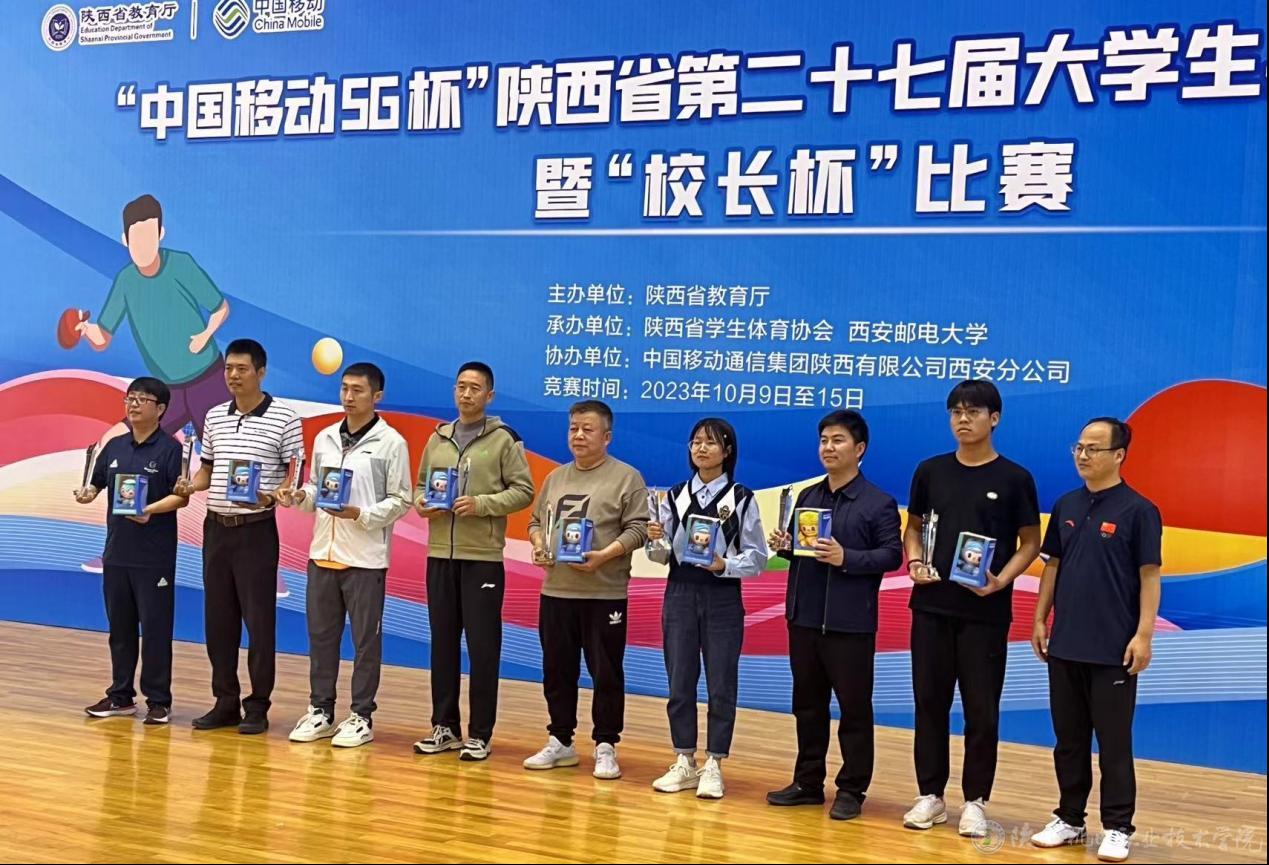 10月15日,由陕西省教育厅主办,陕西省学生体育协会、西安邮电大学承办,陕西省学生体育协会乒乓球专业委员会协办的第二十七届大学生乒乓球锦标赛暨“校长杯”比赛在西安邮电大学(长安校区)圆满落幕。我院派出书记伊逊智、院长向纪明、党委委员赵争东参加比赛,校工会委员王文忠带队,参赛选手刻苦训练,经过为期两天激烈精彩的比拼,最终取得了甲组团体第五名的优异成绩。