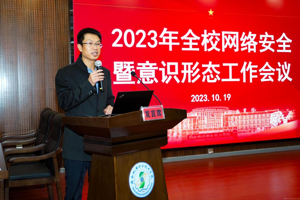 为深入学习贯彻习近平总书记对宣传思想文化工作作出的重要指示精神,全面落实意识形态工作责任制,切实做好学校网络安全及文化宣传工作,10月19日上午,我校在蟠龙校区博学楼111室组织召开2023年全校网络安全暨意识形态工作会议。校党委书记伊逊智出席会议并讲话。党委副书记、院长向纪明,党委副书记张琴,党委委员、副院长张克,副院长张新堂出席会议。会议由党委委员、宣传部部长李明主持。