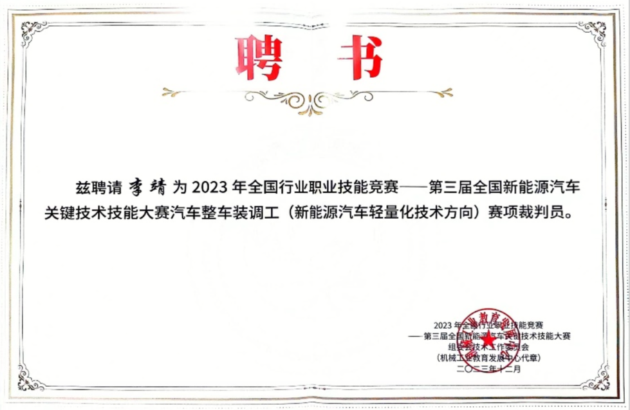 大赛期间,李靖积极与其他裁判员进行赛项讨论及业务交流,赛后积极与汽车整车装调工(新能源汽车轻量化技术方向)赛项参赛选手深度交流。通过与来自全国各地车企职工和院校师生的交流,现场参与了目前国内整车装调的先进技术技能,获得了很多宝贵经验,为我校新能源汽车技术专业群发展以及大赛备赛方面提供了经验支持。