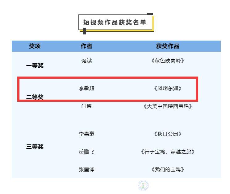 近日,由中共宝鸡市委宣传部、宝鸡市文化和旅游局主办,宝鸡市旅游服务中心、宝鸡市摄影家协会承办的2023秋季宝鸡旅游摄影短视频大赛颁奖典礼在宝鸡市太白县成功举办,我校教师李敏超荣获二等奖并受邀参加颁奖典礼。