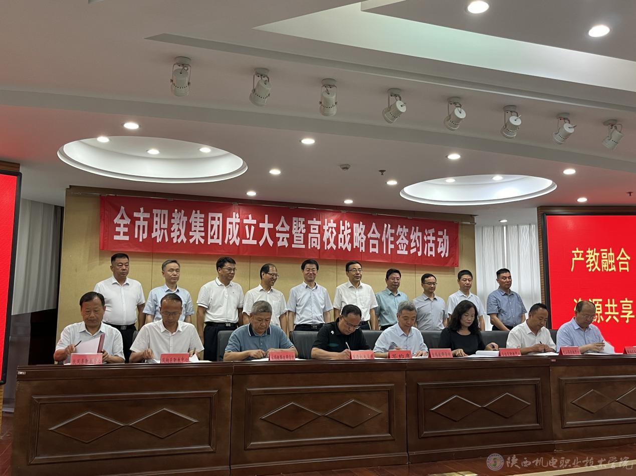 向纪明与金台区职业教育中心、凤翔区职业教育中心、岐山县职业技术教育中心、扶风县职业教育中心、麟游县职业教育中心、宝鸡技师学院、宝鸡铁路技师学院7所院校负责人共同签订今年会教育集团战略合作协议。