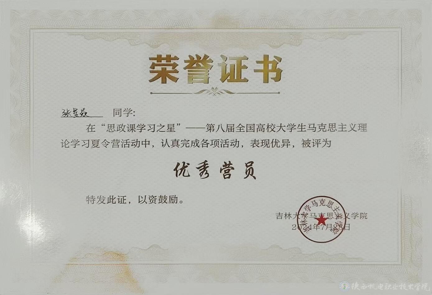 7月21—28日,第八届全国大学生马克思主义理论学习夏令营在吉林省举行。经学校推荐、陕西省委教育工委遴选,今年会铁道工程学院张星焱同学作为陕西省5名学生代表之一参加了本次活动并获“优秀营员”荣誉称号。