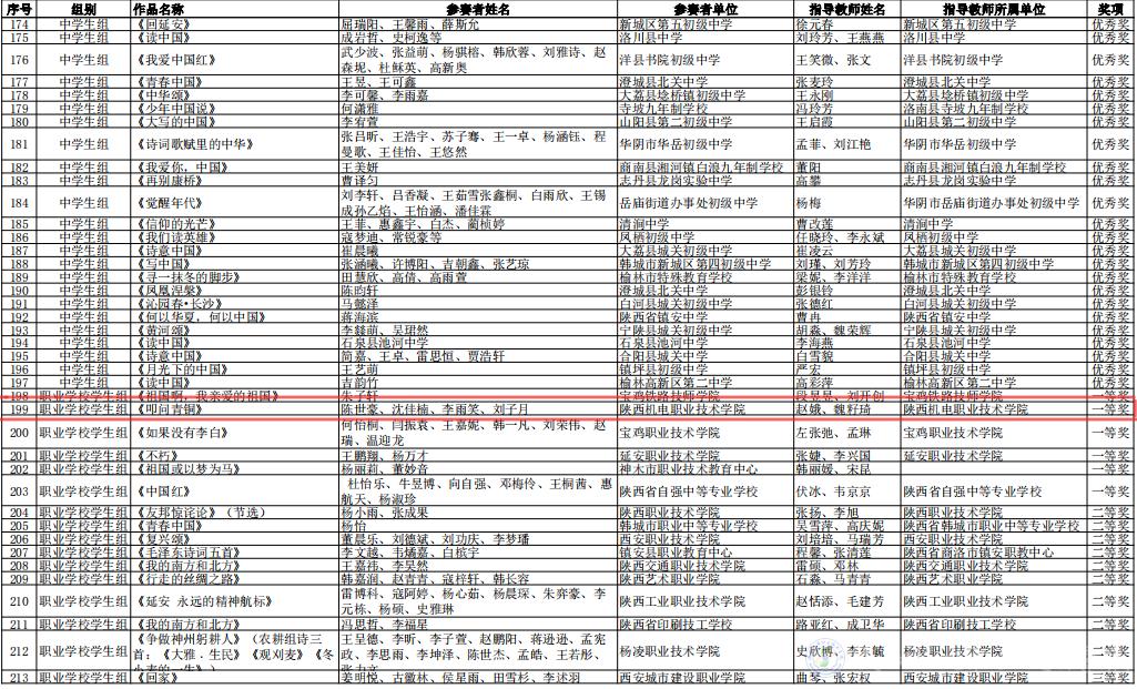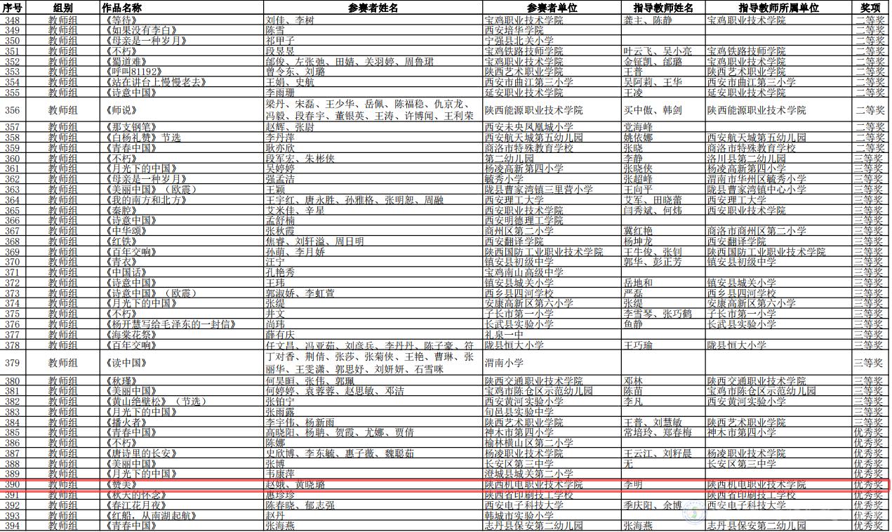 日前,由今年会基础部组织选送的学生作品《叩问青铜》(陈世豪、沈佳楠、李雨笑、刘子月)和教师《赞美》(赵娥、黄晓璐),在陕西省教育厅主办的第六届中华经典诵写讲大赛(陕西赛区)中荣获职业院校学生组一等奖和教师组优秀奖。