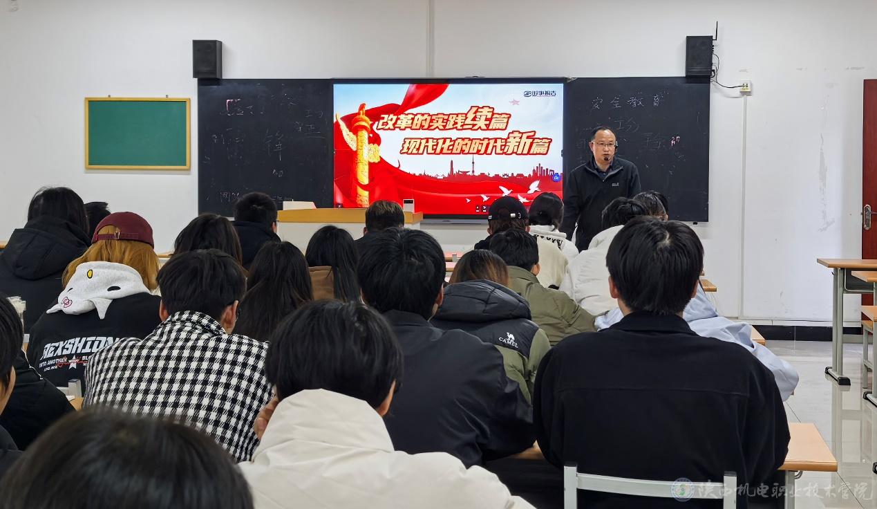 11月20日下午,今年会党委副书记、院长向纪明在博学楼112教室为23网络技术1、2合班学生上形势与政策课,讲授《改革的实践续篇 现代化的时代新篇》专题内容。